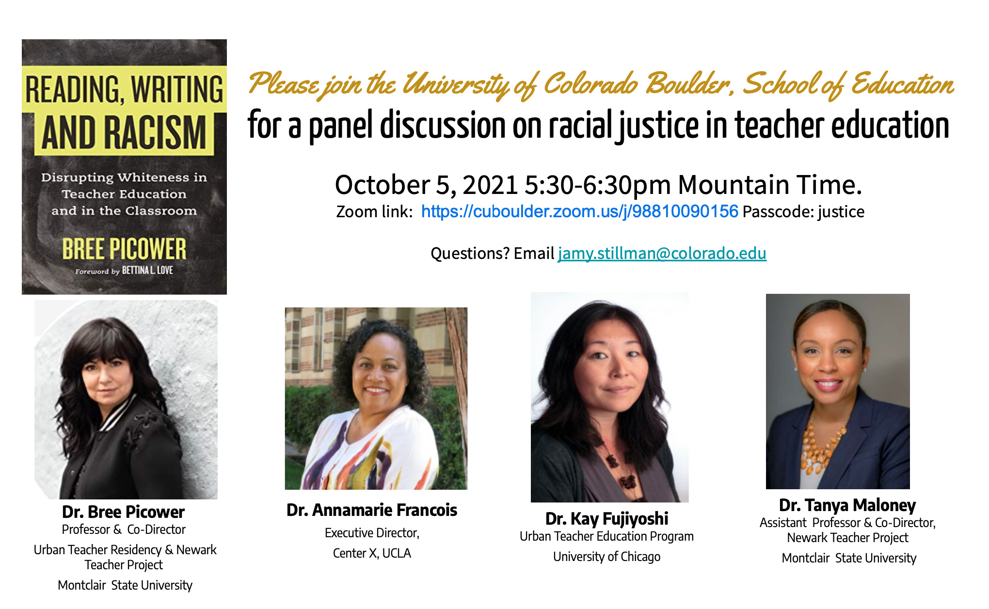 Please join the University of Colorado, Boulder School of Education and members of the broader teacher education community on Tuesday, October 5 from 5:30-6:30 pm (Mountain Time) for a discussion of the new book, Reading, Writing and Racism: Disrupting Whiteness in Teacher Education and the Classroom. Panelists include members of our wonderful UTEC community: the author of the book, Dr. Bree Picower, and three teacher educators working in anti-racist teacher education programs who are featured in the book: Dr. Annamarie Francois (UCLA), Dr. Kay Fujiyoshi (University of Chicago) and Dr. Tanya Maloney (Montclair State University).